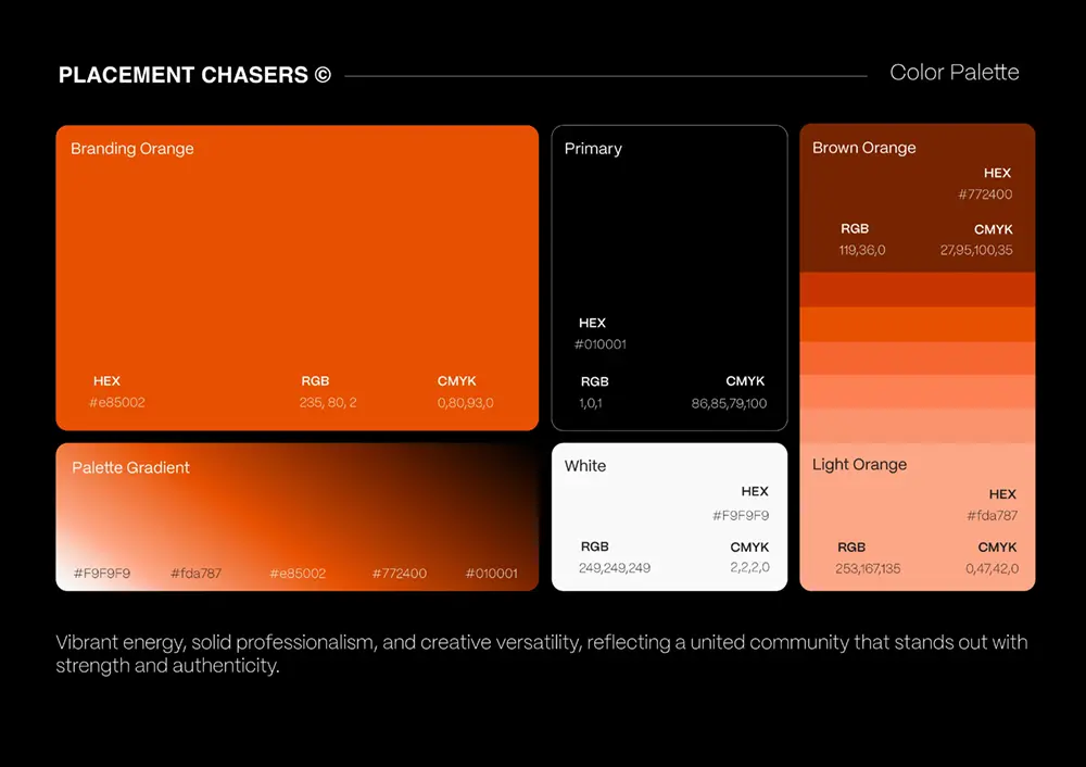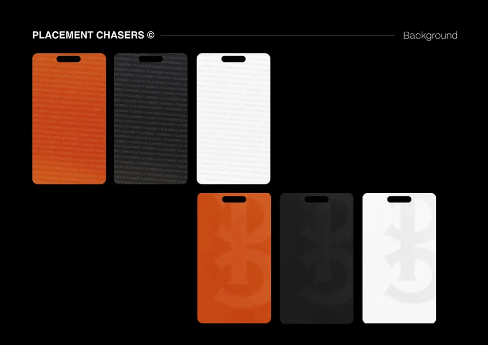 La propuesta se completa con fondos gráficos personalizables que funcionan como base para credenciales, posts y elementos visuales en redes, adaptándose a diferentes formatos sin perder consistencia. Este sistema visual no solo representa a Placement Chasers como marca, sino que también refuerza su identidad como movimiento cultural.