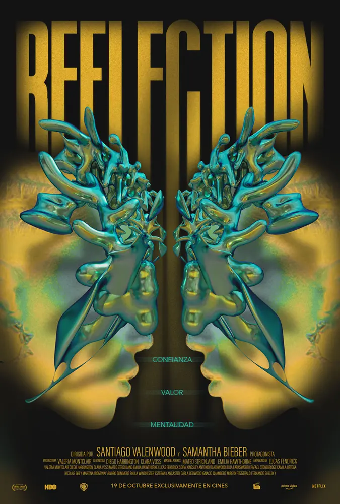 Como parte de un proyecto universitario, tuve la oportunidad de diseñar un cartel para una película titulada «Reflection», que explora temas de autoestima y las complejidades de la mente humana. Incorporé el concepto de espejos con caras, simbolizando la introspección y la auto-percepción. Para ilustrar más la complejidad de la psique humana, introduje una máscara cromada abstracta y deformada que simula un espejo distorsionado. Esta elección de diseño sirve como una metáfora de las percepciones distorsionadas y los desafíos que enfrentan los individuos al entender su propio valor.